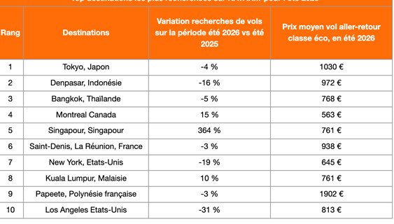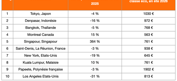 Pour l’été 2026, les Français voient loin et rêvent grand. Tokyo, Denpasar (Bali) et Bangkok forment un trio de tête très asiatique, confirmant l’envie d’évasion tropicale et culturelle. Montréal et New York restent des valeurs sûres pour un city break estival.