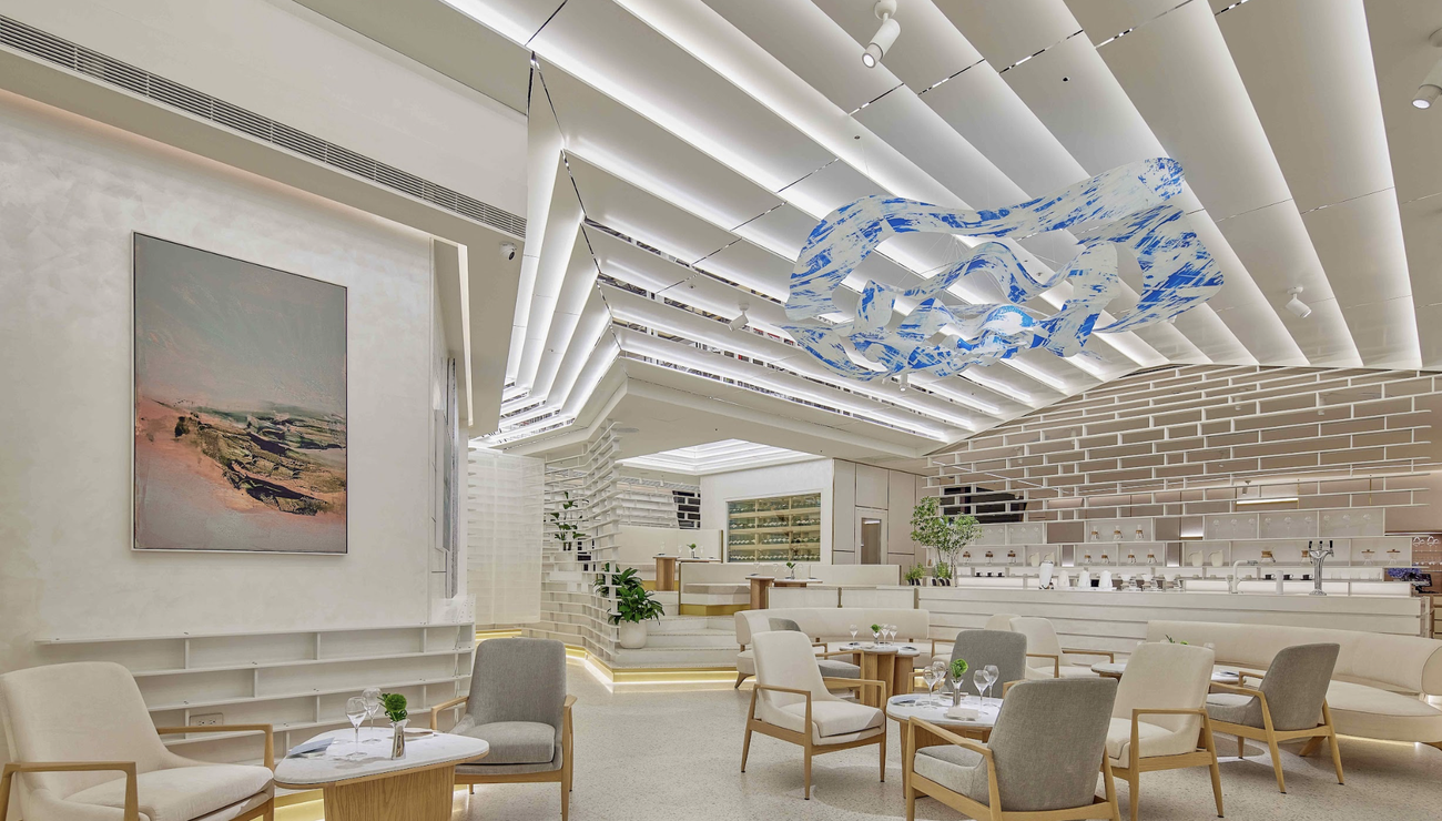 Niché en haut d’un immeuble, en plein cœur de Taipei, non loin de l’iconique Taipei 101, A (Taipei) se mérite. On y accède par un ascenseur, comme un sas de transition. Lorsque les portes s’ouvrent, le tumulte de la ville disparaît pour laisser place à un univers presque irréel : une lumière blanche, claire, enveloppante, des volumes épurés, une atmosphère apaisante.
