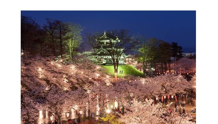 Direction la préfecture de Niigata, à Jōetsu, le parc du château de Takada propose un spectacle nocturne remarquable durant le hanami. Entre début et mi-avril, près de 4 000 cerisiers forment une voûte florale que des milliers de lanternes (près de 3000) viennent magnifier à la tombée du jour. Les reflets dans les douves, autour de la tourelle, ajoutent une dimension poétique à l’ensemble.