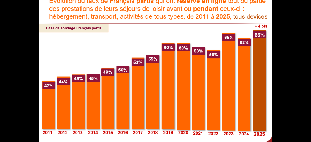 Au-delà de la préparation du séjour, le digital s’impose également dans la transaction. 66 % des Français ont réservé en ligne tout ou partie de leurs prestations touristiques en 2025, un niveau record selon le baromètre.