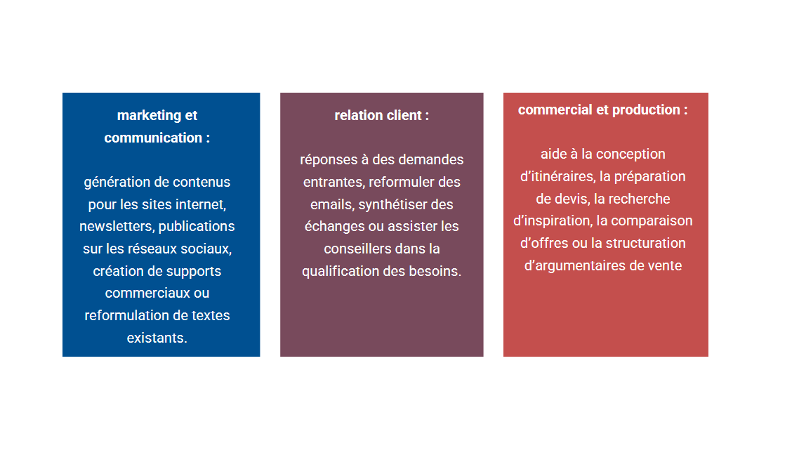 Les résultats du questionnaire confirment que les opérateurs de voyage identifient lacréation de contenu et l’automatisation des interactions clients comme les leviers les plus immédiats de valeur ajoutée.
