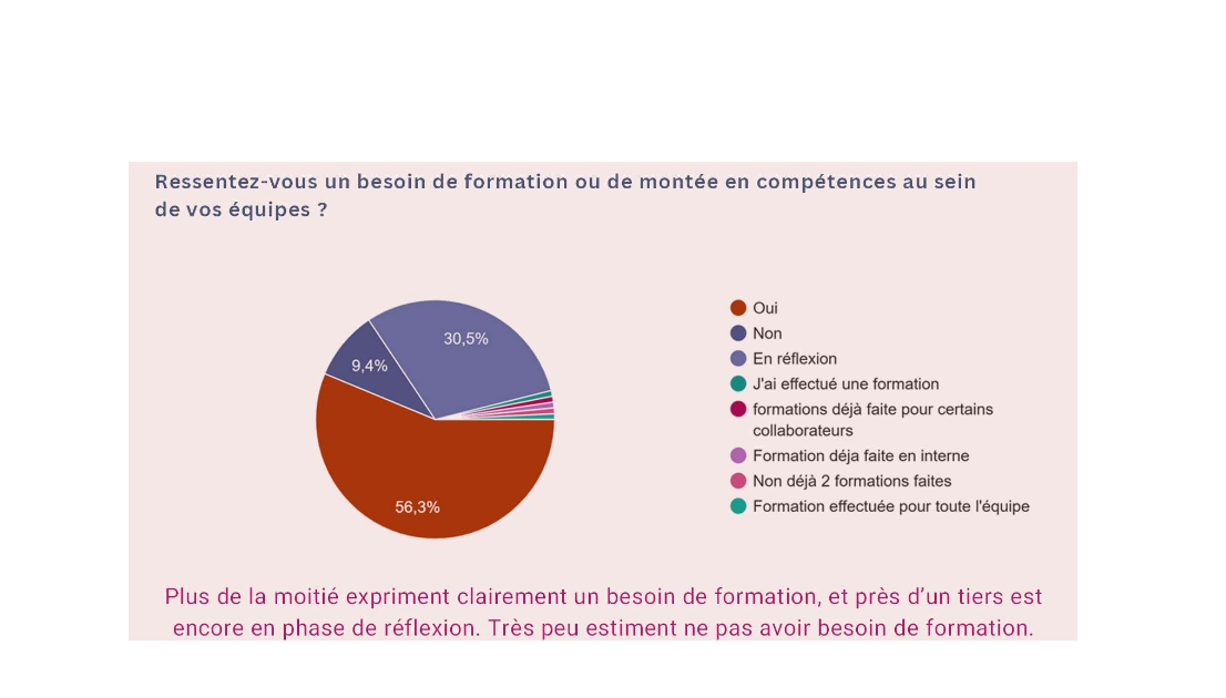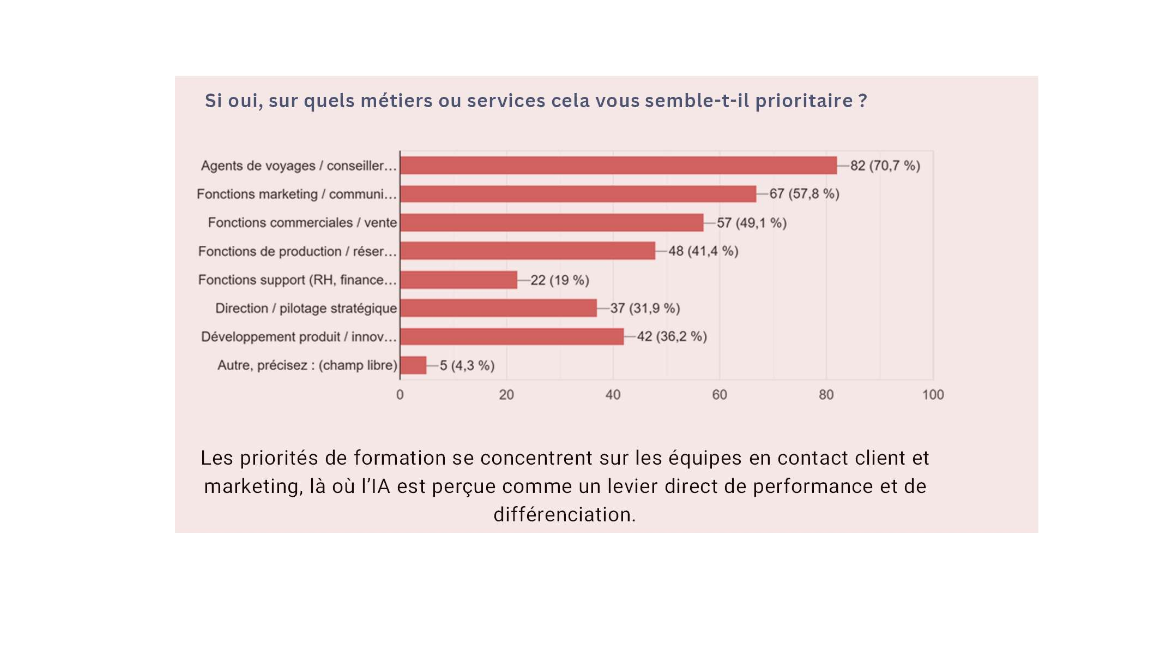 Ces freins expliquent le besoin de formation demandé par les professionnels : plus de 50% des répondants l'expriment clairement. Près d'un tiers sont encore en phase de réflexion, et très peu estiment ne pas en avoir besoin. Les priorités se concentrent sur les agents de voyages et conseillers en contact client (70,7% des entreprises l'identifiant comme prioritaire), les fonctions marketing (57,8%) et les équipes commerciales (49,1%).