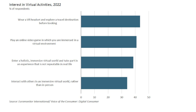 En 2022, une étude d’Euromonitor International* montre que le premier intérêt de la réalité virtuelle pour le grand public est le voyage, alors que ces technologies sont encore aujourd’hui utilisées presque exclusivement pour les jeux vidéo :