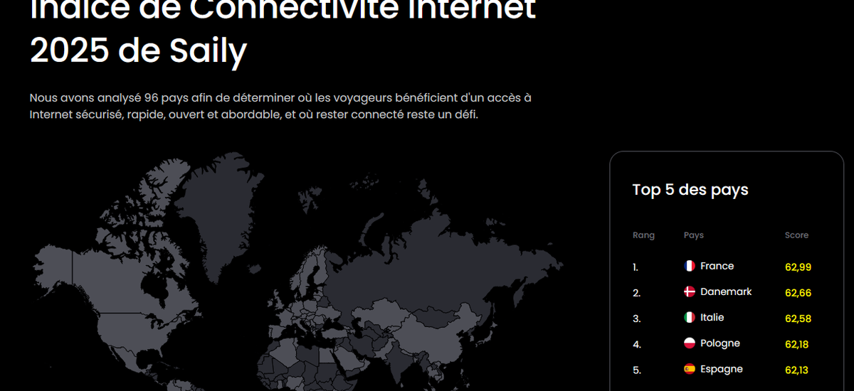 Pour déterminer dans quelle mesure il est facile de rester connecté, les chercheurs de Saily ont analysé les connexions Internet de 96 pays, en évaluant des critères liés à la qualité, à l'accessibilité financière, à la cybersécurité et à la liberté.