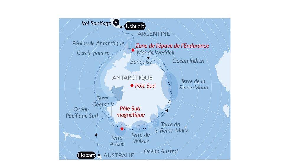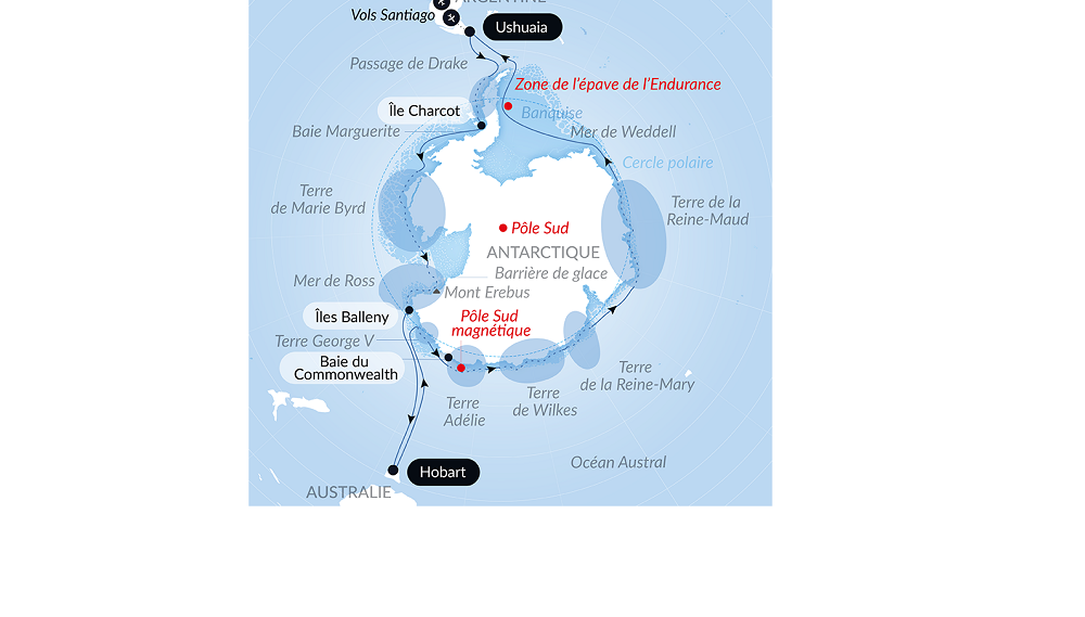 - Évocation des grandes épopées polaires — Sir Ernest Shackleton, Sir Robert Falcon Scott, le commandant Jean-Baptiste Charcot, Mawson, Amundsen — avec possibilité de visiter des vestiges de campements et de naviguer dans la zone du naufrage de L’Endurance