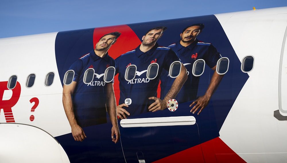 La livrée met en scène six joueurs emblématiques du XV de France — Théo Attissogbe, Louis Bielle-Biarrey, Antoine Dupont, Yoram Moefana, Damian Penaud et Thomas Ramos — dont les portraits s’affichent sur le fuselage dans une composition graphique aux couleurs bleu, blanc et rouge. L’ensemble s’accompagne du slogan « Qui a dit que les coqs ne savaient pas voler ? », clin d’œil à l’esprit combatif du rugby français.